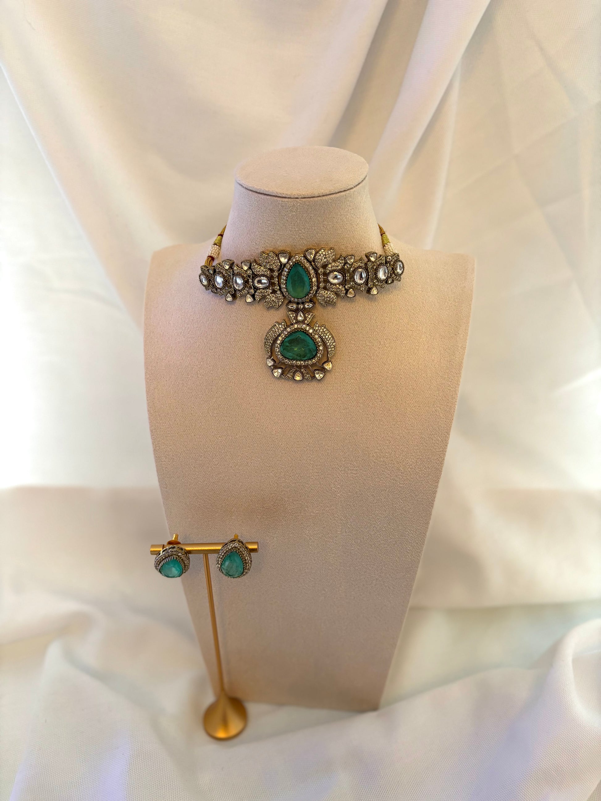 This beautifully crafted piece exhibits gold plated hardware with mint polki stone.