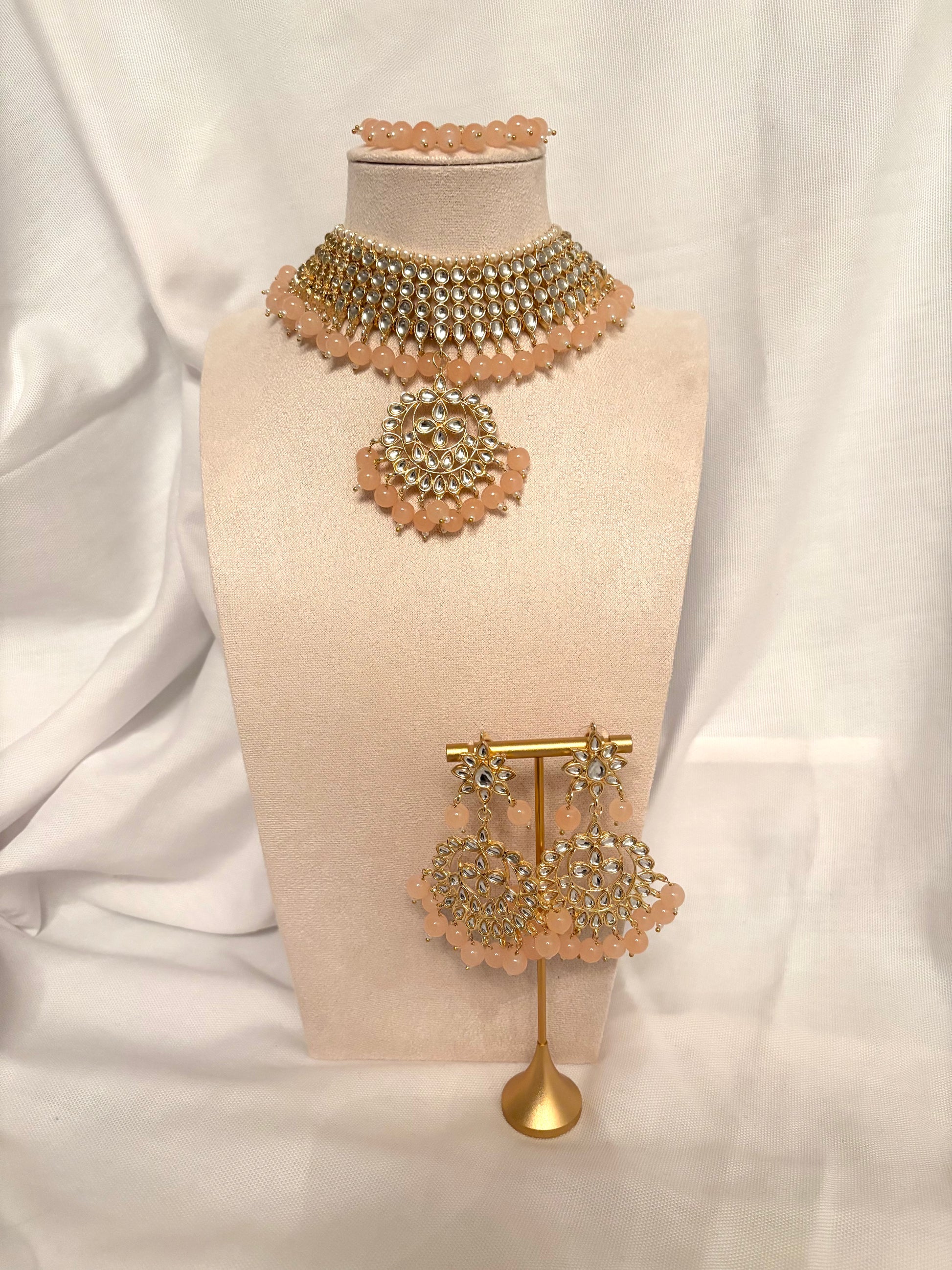 This beautifully crafted piece exhibits gold plated hardware with faux kundan and peach accents.