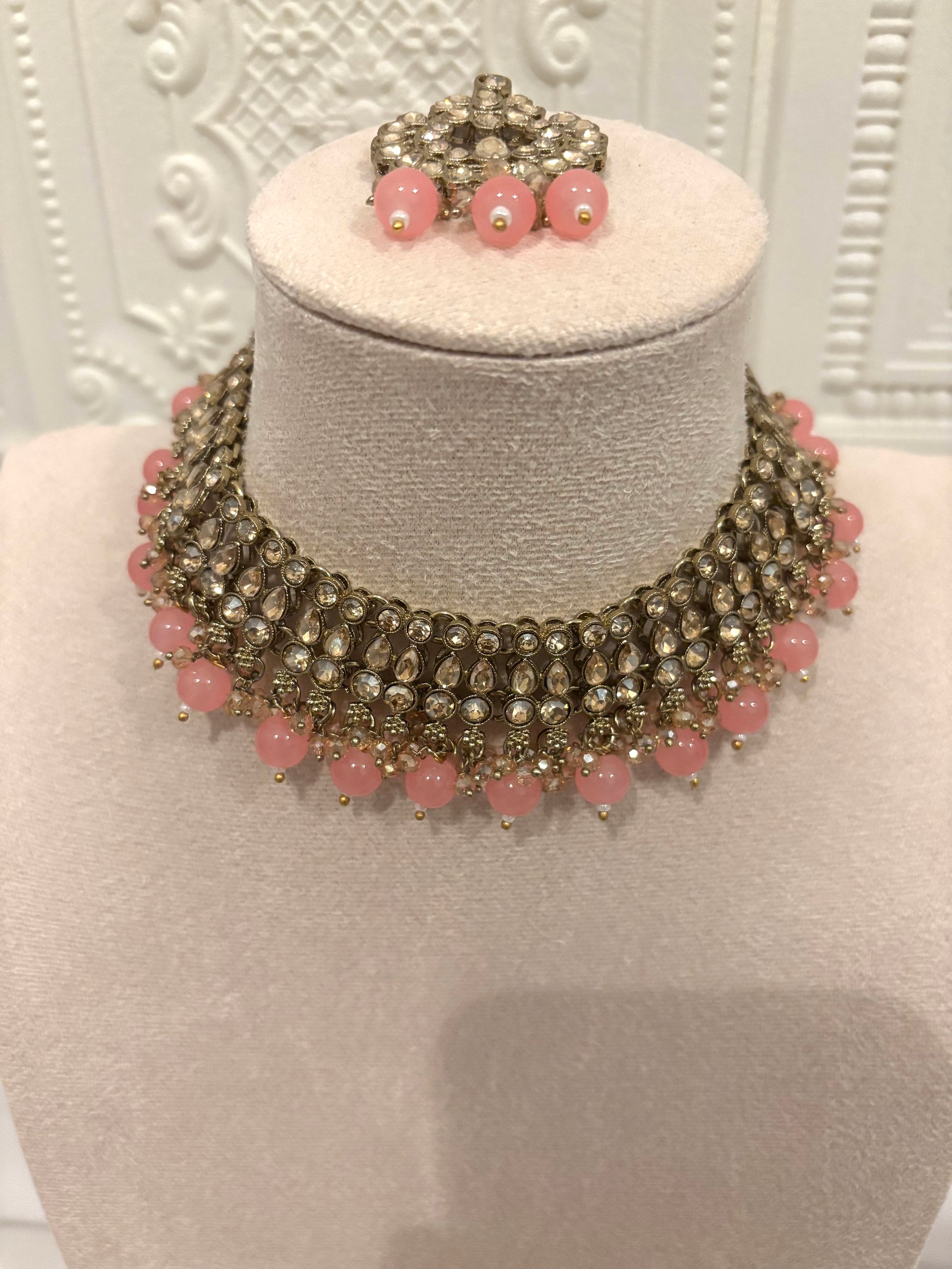 This beautifully crafted piece exhibits gold plated hardware with bronze faux kundan and pink accents.