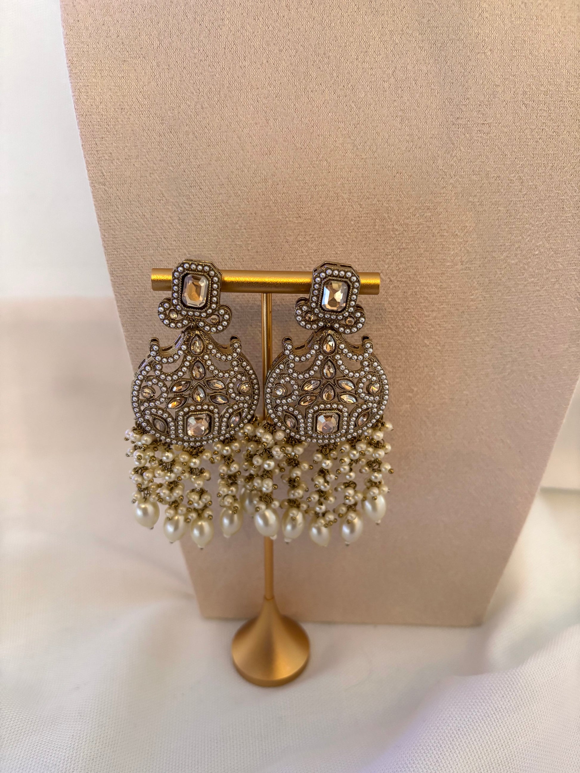 This beautifully crafted piece exhibits gold hardware with white beading and pearl accents.